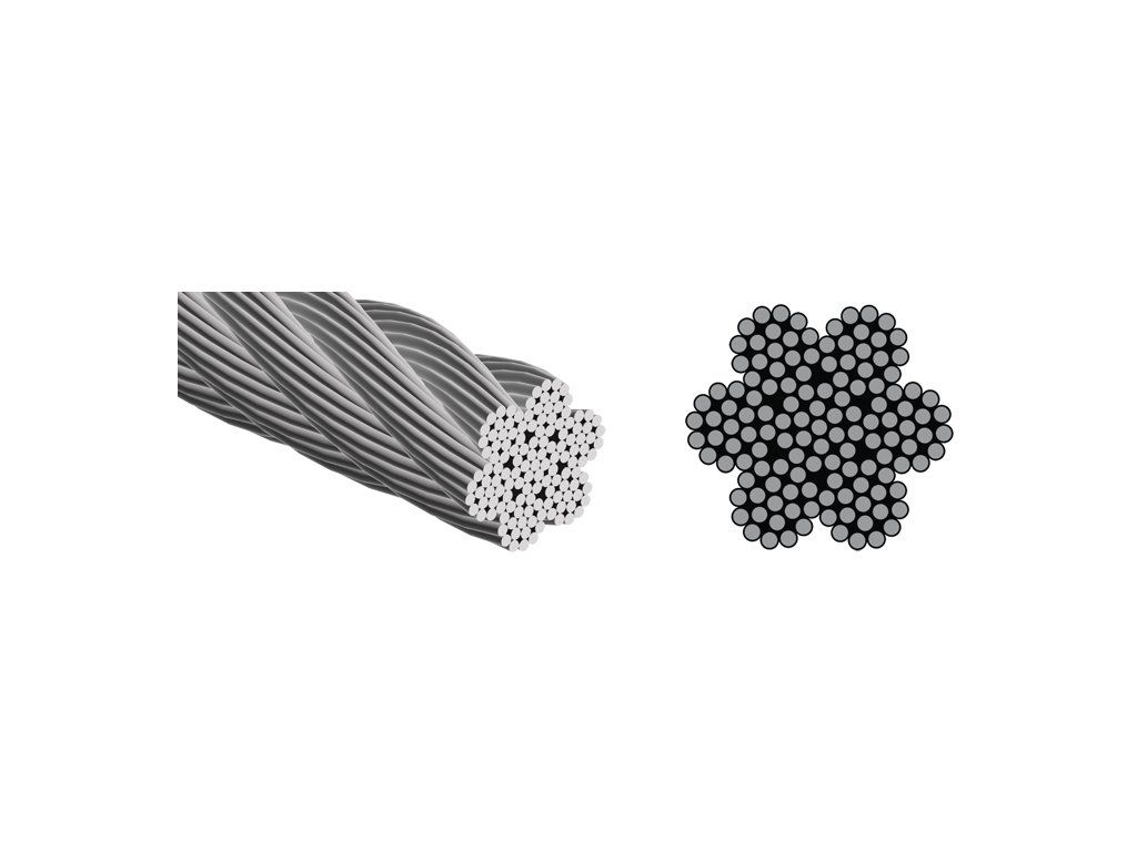- Nerezové lano konstrukce 7x19 má 7 pramenů, po 19 drátech, z materiálu AISI 316