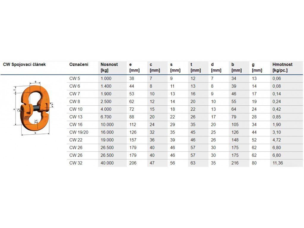 Univerzální CW Connex spojovací článek. Užití: zavěšovací článek - řetěz; řetěz- řetěz; řetěz- hák; zavěšovací článek - hák; apod.- Univerzální CW Connex spojovací článek se skládá ze dvou symetricky kovaných částí, jednoho čepu a bezpečnostní pojistky.