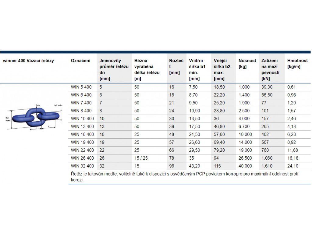 Řetězy z kruhové oceli jsou zejména vhodné pro zavěšování a kotvení. Upraveno pro vyšší nosnosti. Použitelné při maximální teplotě do 400 °C.Winner 400